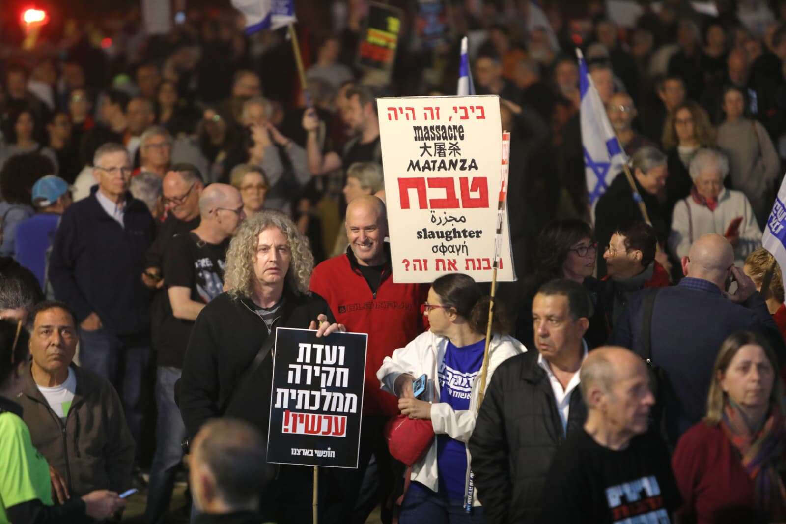 למרות האובך הכבד, גם הערב (שבת) התקיימה עצרת המחאה המרכזית בכיכר הבימה בתל אביב. אל האירוע הגיעו מפגינים רבים, שקראו לממשלה לקחת אחריות על אירועי 7 באוקטובר והמלחמה, ודרשו הקמת ועדת חקירה ממלכתית. את העצרת הנחתה העיתונאית לינוי בר גפן, ונשאו דברים הילה אביר, ממייסדי "מועצת אוקטובר"; אורי תובל, משנה לעורך "תלם" וחוקר פרשת "קטארגייט"; ומורן זר קצנשטיין, מייסדת "בונות אלטרנטיבה".