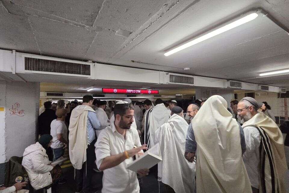 בחניון של דיזנגוף סנטר שבתל אביב תועדו מתפללים מבתי הכנסת הסמוכים, שהציבו מחיצה במקום על מנת להמשיך בקריאת התורה גם במרחב המוגן.