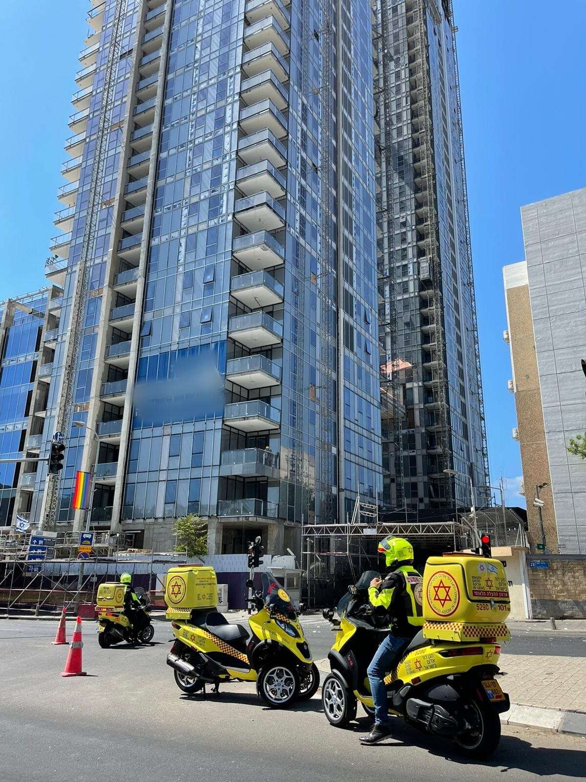 התאונה התרחשה באתר בנייה ברחוב אליעזר קפלן בתל אביב • חובשים ופרמדיקים של מד"א שהוזעקו לזירה דיווחו שהפועל נפל מגובה ונמצא מחוסר הכרה ללא סימני חיים • שני פועלים נוספים נפצעו קל כתוצאה מהקריסה • מכבאות והצלה נמסר כי הפיגום בקומה ה-41 בגורד שחקים בן 42 קומות