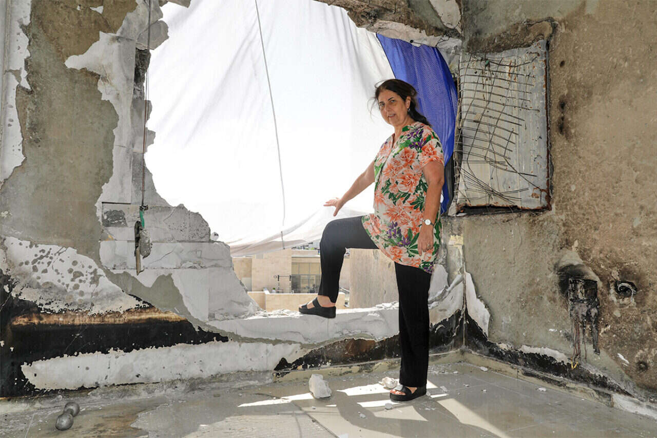 את הפתח הגדול שנפער מהפגיעה מכסה דגל ישראל ענקי. הבית שלה כולו שחור מבפנים בעקבות הפיח הרב, ואילו היא נשארה כמעט חסרת כל.