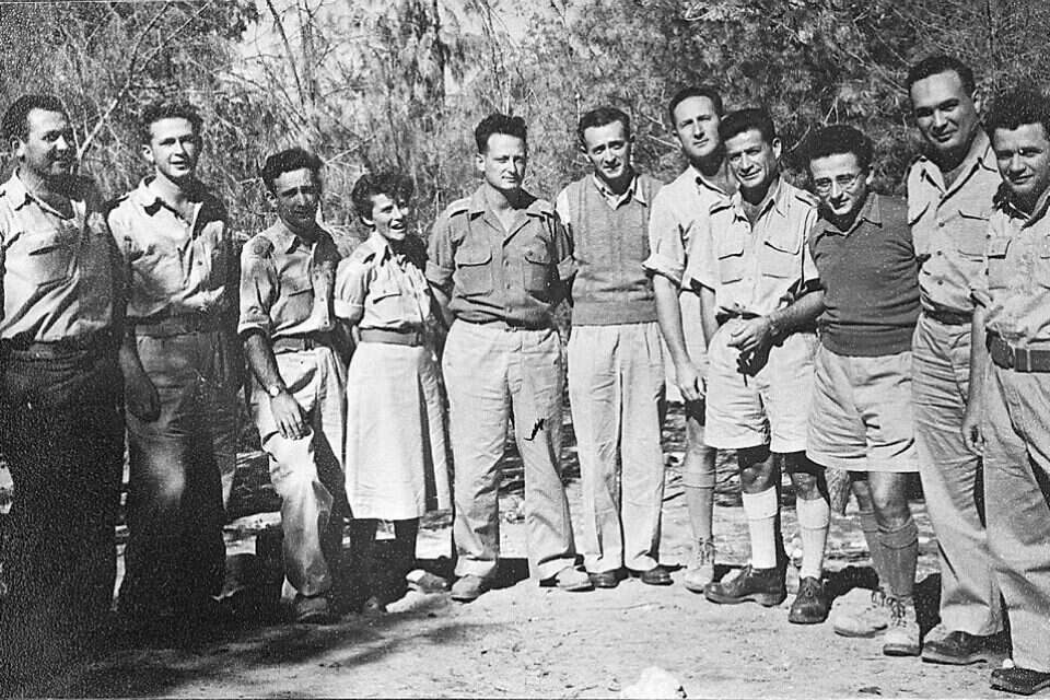 יצחק רבין (שני משמאל) ויגאל אלון (במרכז) בצילום קבוצתי של מפקדי הפלמ"ח, צילום: לע"מ