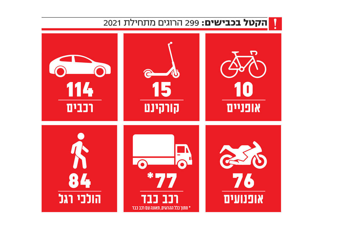 עוד עולה כי בשנת 2021, החודשים מארס-ספטמבר היו החודשים הקטלניים ביותר בארבע השנים האחרונות. מספר רוכבי הדו־גלגלי שנהרגו - 76 מתחילת השנה, הנתון הגבוה ביותר אי פעם. 84 מההרוגים הם הולכי רגל, ו־77 נהרגו בתאונות במעורבות רכב כבד. 10 מההרוגים הם רוכבי אופניים ו־15 הם רוכבי אופניים חשמליים וקורקינטים.
