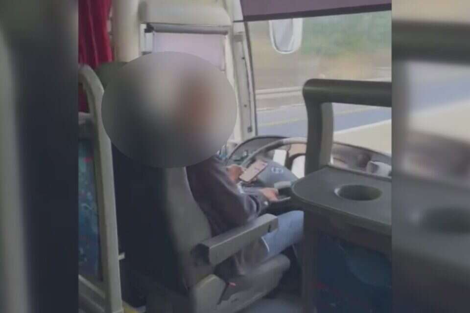 נהג הסעות בחברת "ע.תמר" צולם היום (רביעי) אוחז בטלפון הנייד כשהוא קורא ומסמס תוך כדי נהיגה. הנהג מסיע מדי בוקר את ילדי קיבוץ עין דור לתיכון העמקים-תבור.