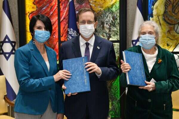 הנשיא הרצוג מקבל לידיו כרכים של כתבי המשורר אורי צבי גרינברג | צילום: חיים צח