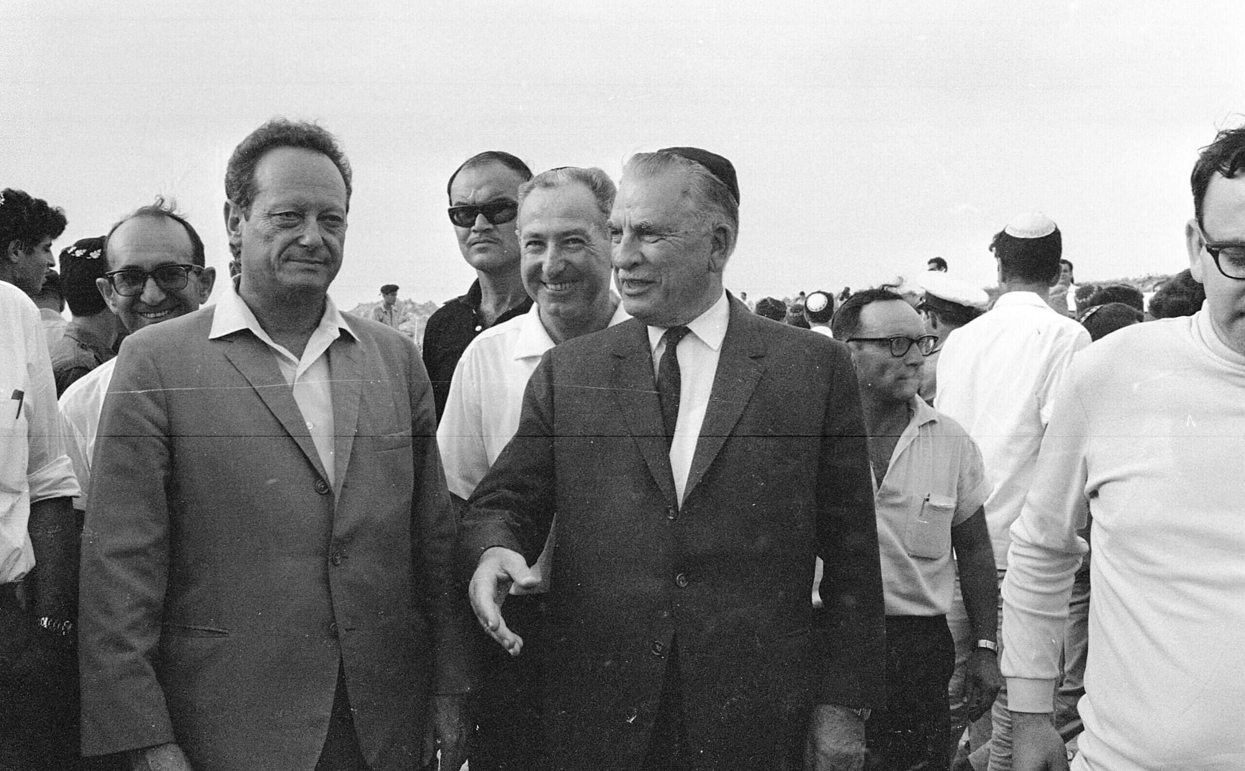 מושקוביץ (מאחור) בטקס הנחת אבן הפינה למרכז התרבות בגוש עציון // צילום: אוסף דן הדני, הספרייה הלאומית // משה מושקוביץ (מחייך במרכז) בטקס הנחת אבן פינה למרכז התרבות של גוש עציון. מימינו יגאל אלון ומשמאלו חיים משה שפירא, אוקטובר 1969