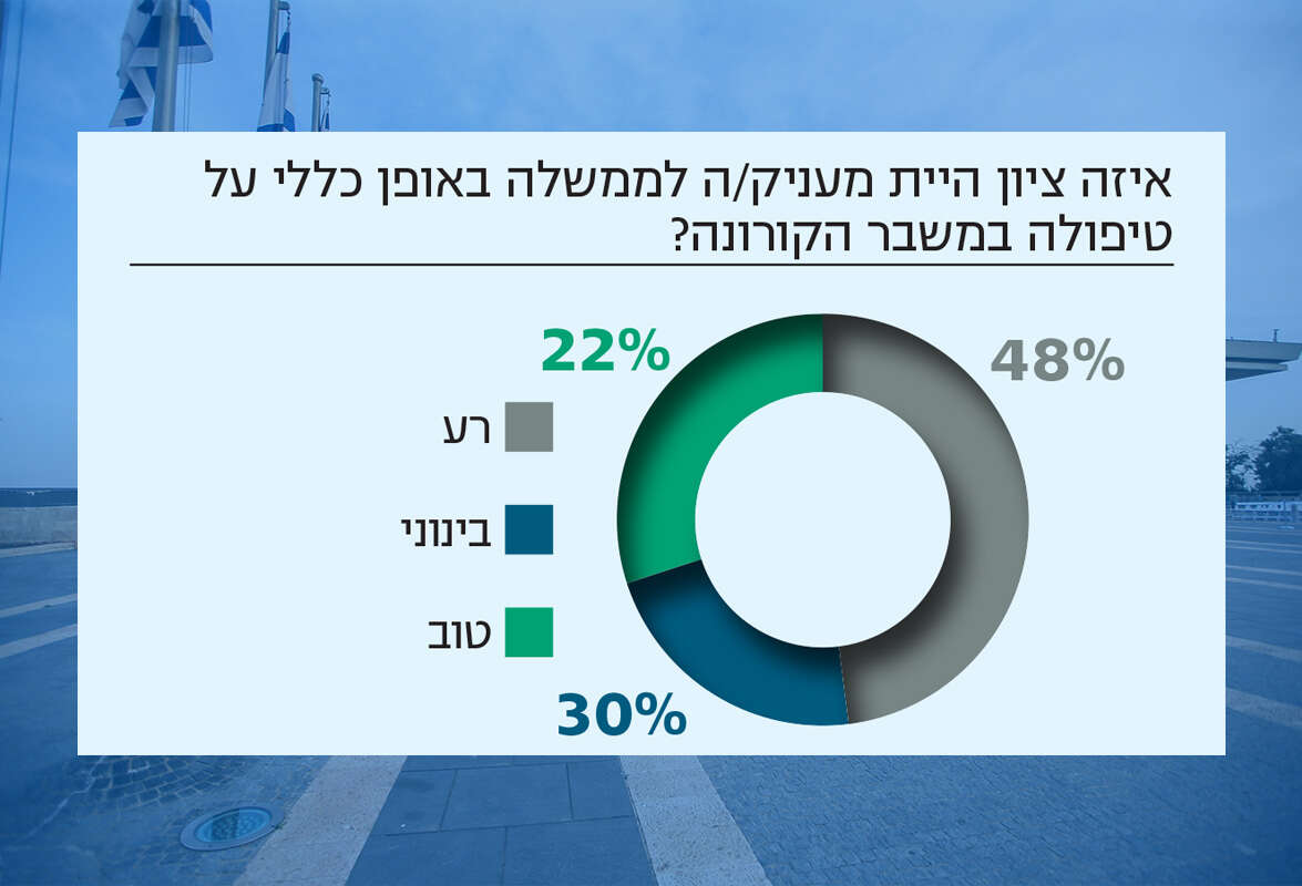 על פי הסקר, רק 22% מקרב הציבור נותנים לממשלה ציון גבוה (טוב וטוב מאוד) על טיפולה במשבר הקורונה, 30% נותנים לממשלה ציון בינוני וכמעט מחצית מהמשיבים (48%) נותנים לה ציון גרוע על תפקודה במשבר הבריאותי הגדול ביותר שפקד את העולם ב־100 השנים האחרונות.