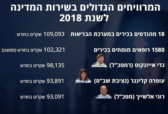בסך הכל, השכר הממוצע בעשירון העליון במערכת הבריאות הגיע ל-77,591 שקלים לחודש. בצה"ל, אלוף הרוויח בשנת 2018 67,135 שקלים לחודש, כאשר תא"ל השתכר 55,996 שקלים. במשטרה הרוויח קצין בדרגת ניצב 55,669 שקלים לחודש, ותת ניצב השתכר שכר נאה 50,263 שקלים.