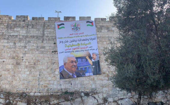 כרזת ענק נתלתה היום על חומות העיר העתיקה בירושלים, סמוך לשער החדש, עם תמונותיהם של נשיא הרשות הפלשתינית, מחמוד עבאס, ושל יאסר ערפאת, לשעבר יו״ר הרשות הפלשתינית וראש אש״ף, הנראים על רקע כיפת הסלע בהר הבית ובין דגלי הרשות הפלשתינית.