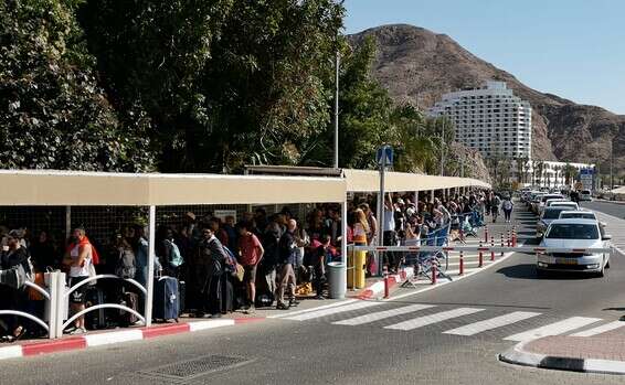 תורים ארוכים מהרגיל כבר בשעות הבוקר. מסוף טאבה, היום // צילום: יהודה בן יתח