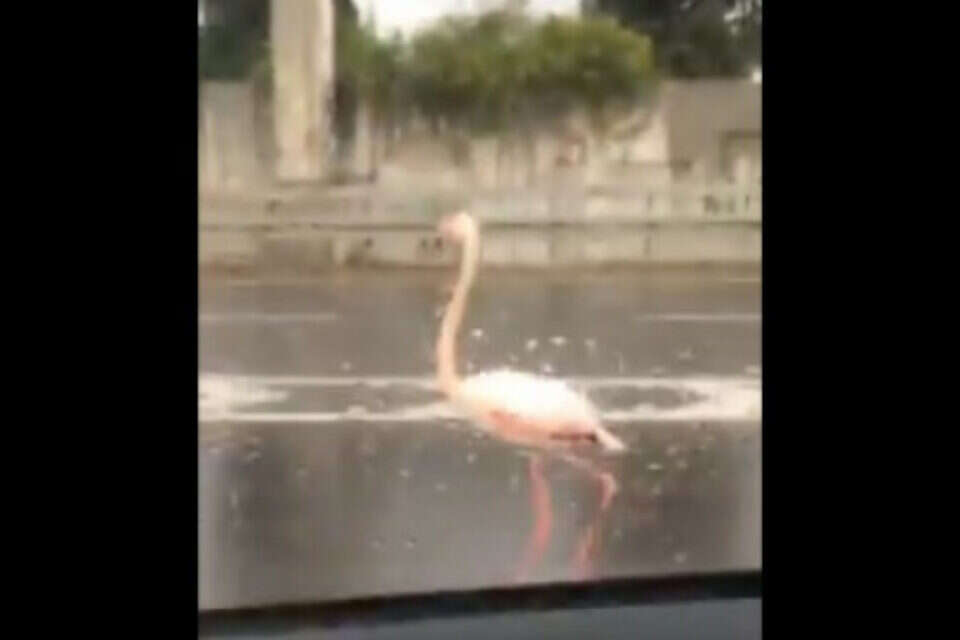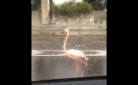 נהגים שנסעו הבוקר (ראשון) בכביש 4 נתקלו במראה לא שגרתי: פלמינגו שטייל בין הנתיבים בכביש המהיר. בירור העלה שהעוף יצא ממתחם הספארי ברמת גן - ככל הנראה בחסות הרוחות העזות.