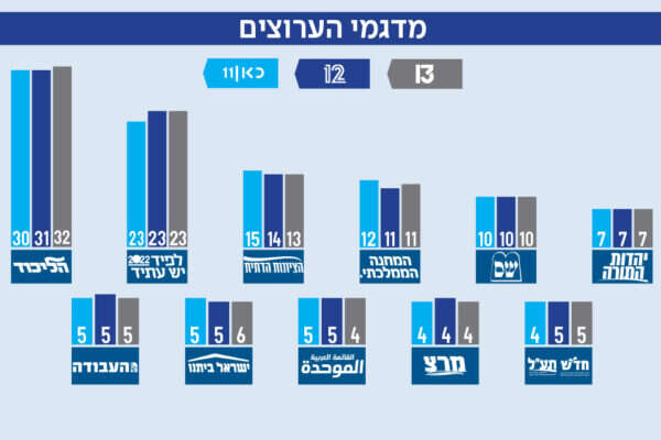 המדגם המעודכן של ערוץ 12 לשעה 2:00 מצביע על חלוקת המנדטים הבאה: