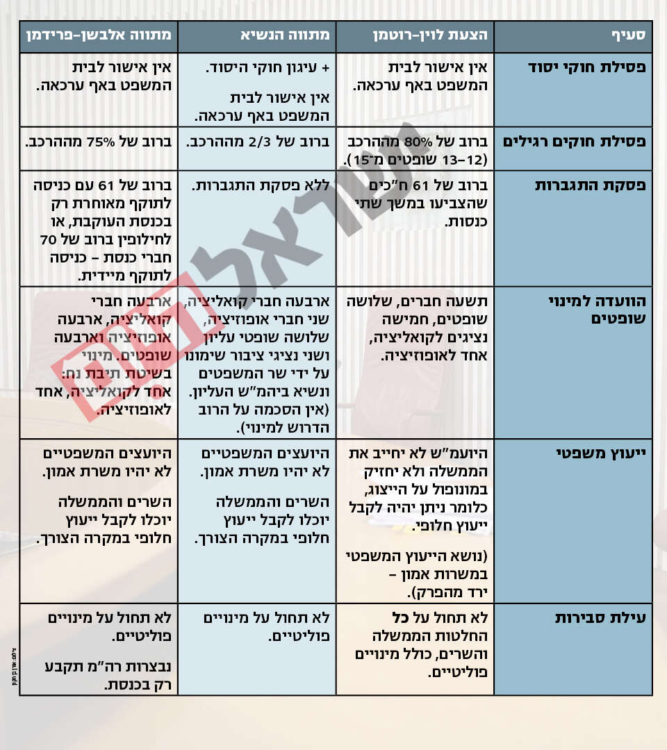 המתווה הקרוי בשם "פשרת פרידמן-אלבשן" זוכה לקבלת פנים חיובית מצד יוזמי הרפורמה שר המשפטים יריב לוין ויו"ר ועדת החוקה ח"כ שמחה רוטמן.מאחורי המתווה עומדים יובל אלבשן (הנחשב למקורבו של לפיד) ודניאל פרידמן, ויחד עימם גיורא איילנד וגיורא ירון.