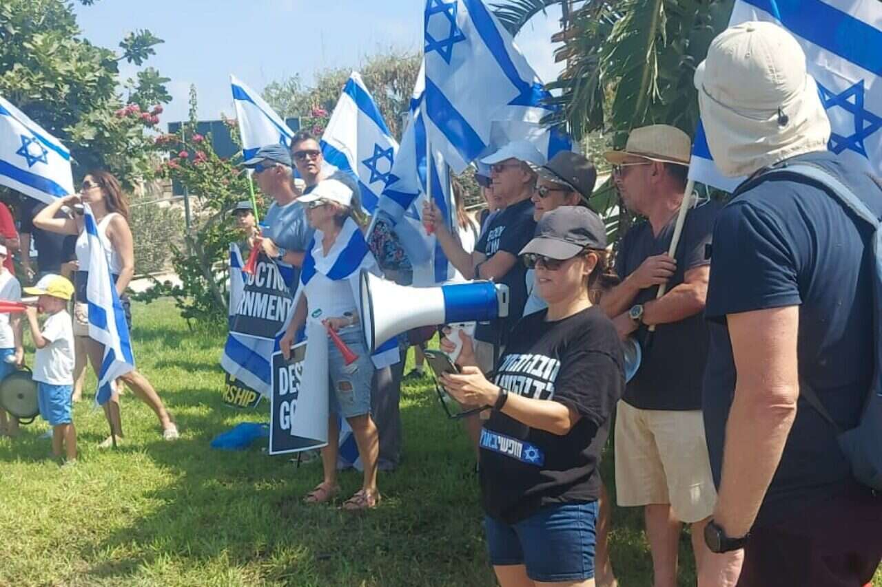עשרות אנשים הפגינו בעקבות הרפורמה המשפטית מול השר לביטחון לאומי השוהה באתר נופש בפאפוס