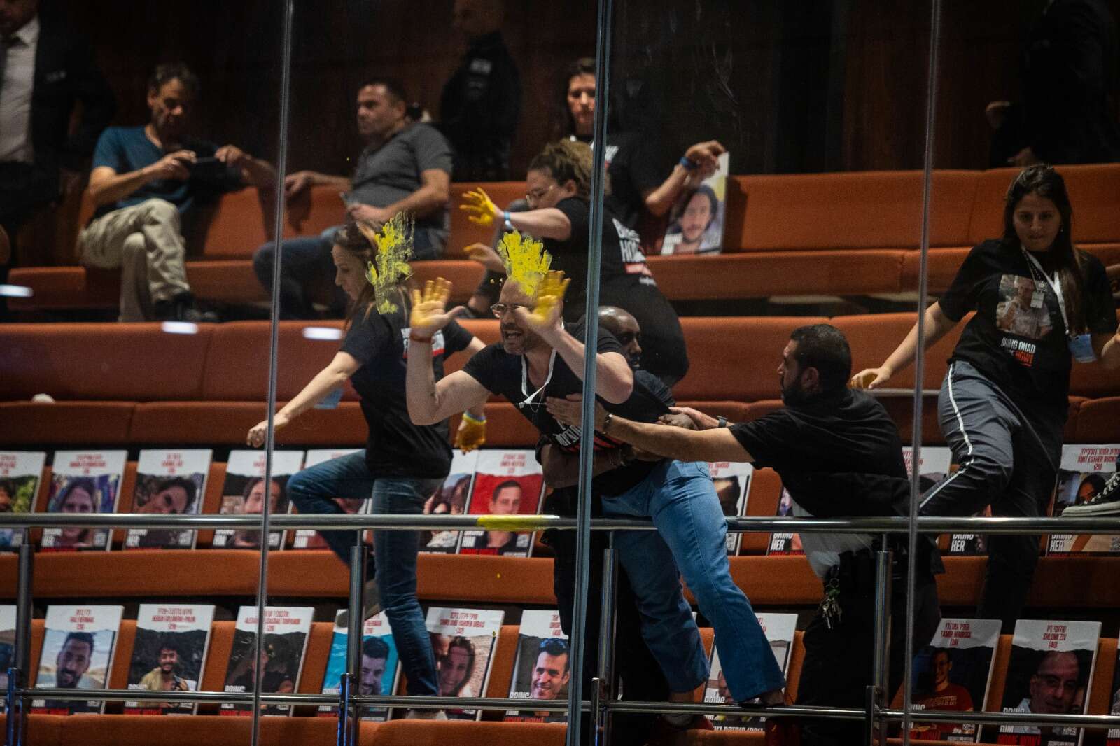 רגע לפני היציאה לפגרה: מהומה במליאת הכנסת התרחשה היום (רביעי) כאשר נציגי משפחות חטופים מחו בעת דיון במליאה. בזמן שישבו ביציע מרחו צבעי גואש על החלונות סביב היציע והניפו את ידיהם הצבועות בצהוב במחאה על סיום מושב החורף של המליאה בעוד ישנם 134 חטופים ברצועה.