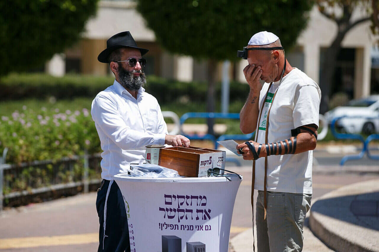 הנחת תפילין בדוכן חב"ד באשדוד, צילום: לירון מולדובן
