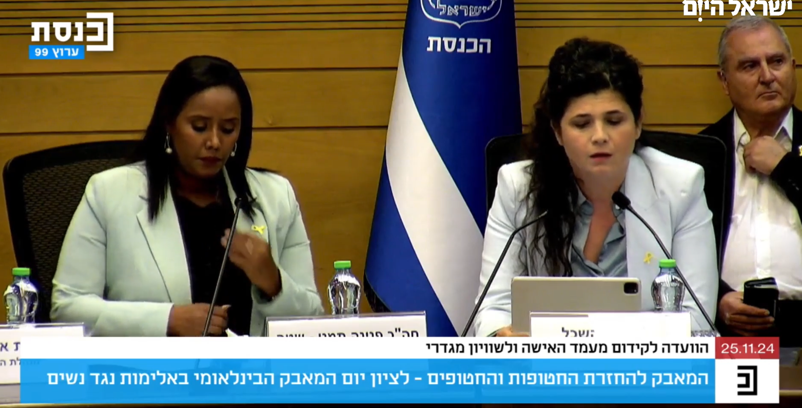 יום המאבק הבינלאומי באלימות נגד נשים מצוין היום (שני), בצל מלחמת חרבות ברזל. הוועדה לקידום מעמד האישה התכנסה במליאת הכנסת לדיון בנתונים שהתקבלו במשרד הרווחה והביטחון החברתי לאורך השנה, שמושפעים באופן ישיר מהמלחמה הארוכה, ובנוסף, דנים גם במאבק להחזרת החטופות והחטופים. באולם נמצאים גם שגרירים זרים, שלוקחים חלק בדיון.