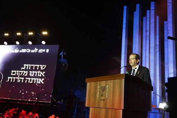 נשיא המדינה יצחק הרצוג נשא דברים הערב (חמישי) בטקס הזיכרון לנופלי ונרצחי השבעה באוקטובר ומלחמת חרבות ברזל, שנערך בגן הגבורה בתחנת המשטרה הישנה של שדרות.