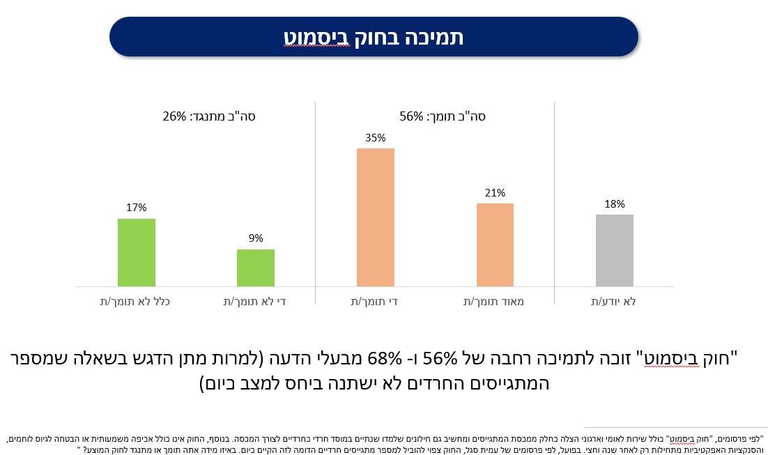 במענה לשאלה "אם חבר כנסת מהליכוד יתמוך בתקציבים למוסדות חרדיים ללא לימודי ליבה ובמתווה גיוס שממשיך את הפטור לרוב הצעירים החרדים – האם הדבר יעלה או יוריד את הסבירות שתצביע לו בפריימריז?", כ-59% מהמתפקדים השיבו כי תמיכה כזו תפחית את הסיכוי להצבעה בפריימריז.