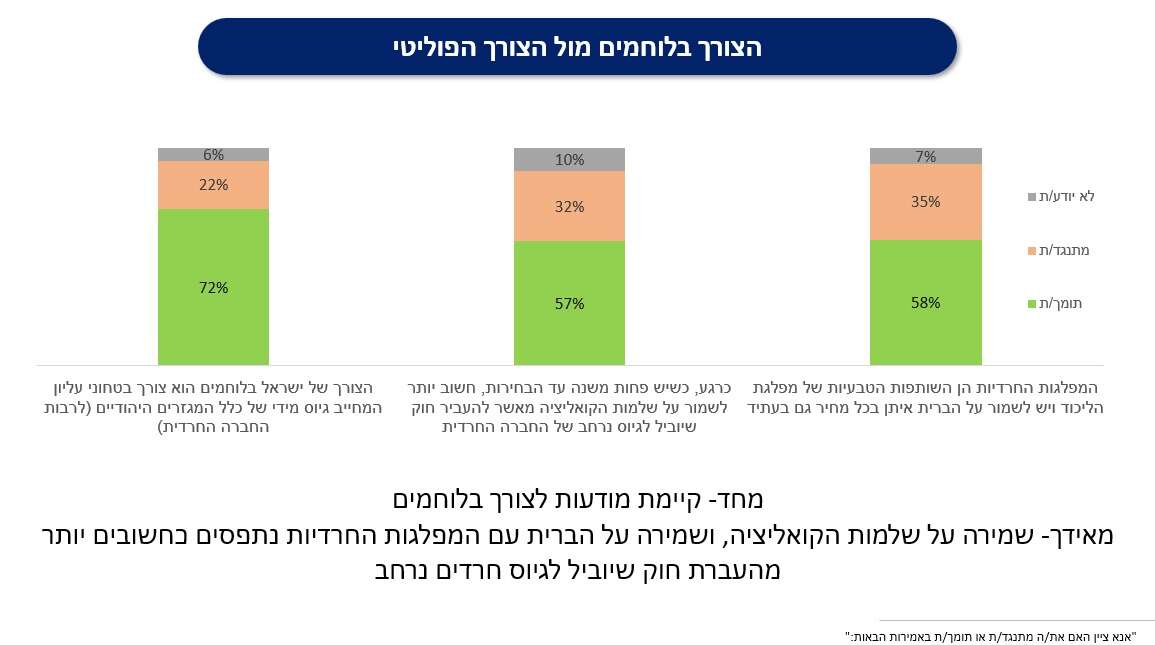 רוב ברור של מתפקדי הליכוד (כ־72%) סבורים שישראל זקוקה בדחיפות ללוחמים, וכי זהו צורך ביטחוני עליון המחייב גיוס מכלל המגזרים, כולל החברה החרדית. רוב המתפקדים רואים באוכלוסייה שאינה משרתת נטל כלכלי הפוגע בחוסן הביטחוני-כלכלי של המדינה (57%), וסבורים שהמשך מימון מוסדות ללא ליבה וללא שירות מחליש את ישראל (57%). עמדה זו מחזקת את הדרישה לשינוי מדיניות.