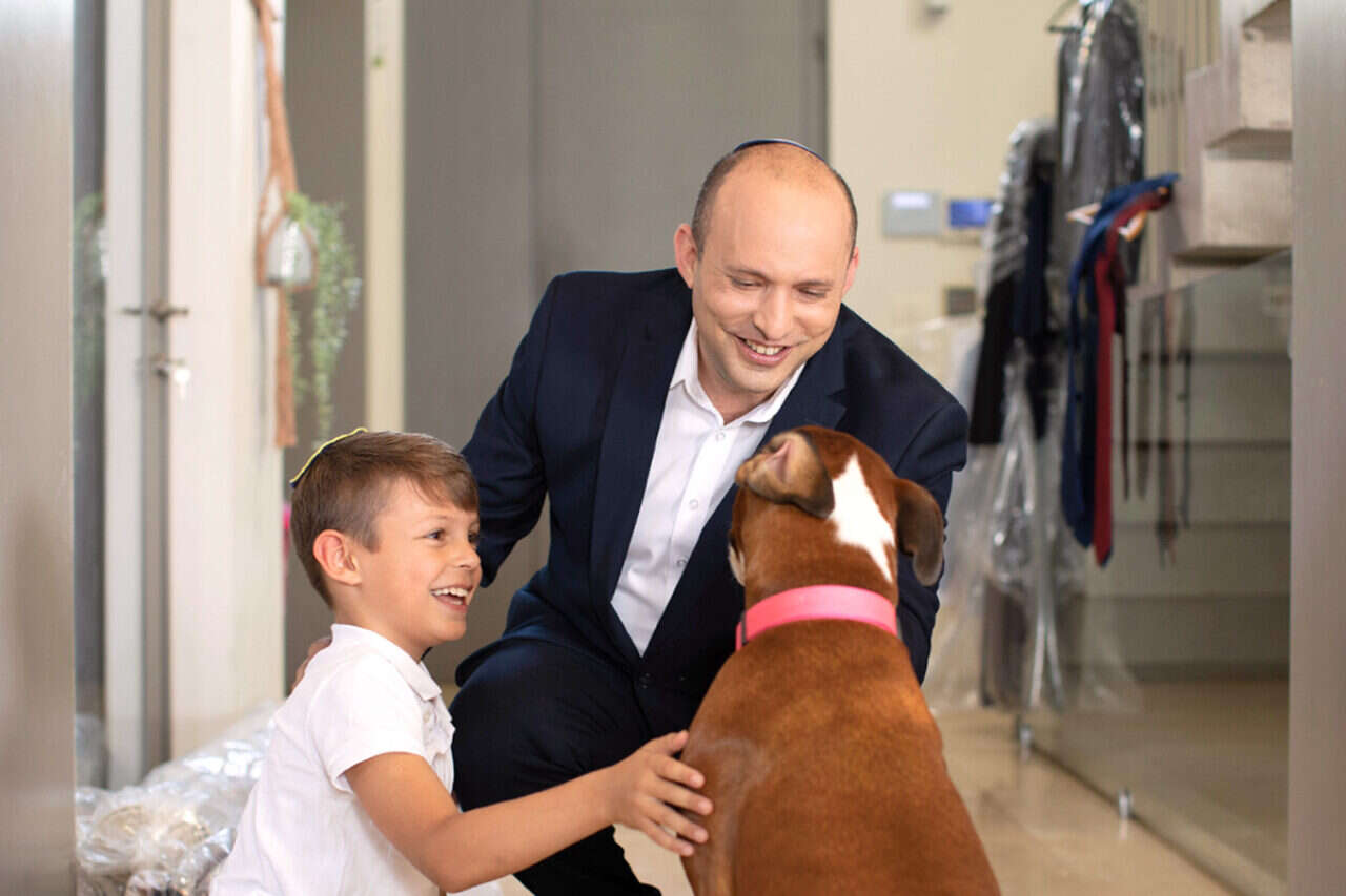 ראש הממשלה המיועד נפתלי בנט עם בנו דוד וכלבת המשפחה ליצ'י, צילום: אריק סולטן