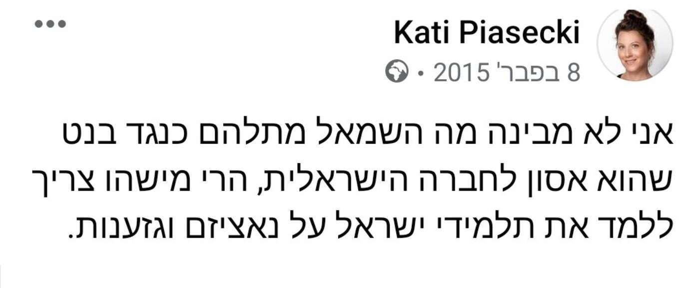 בציוץ על רה"מ נפתלי בנט כתבה: "אני לא מבינה מה השמאל מתלהם כנגד בנט שהוא אסון לחברה הישראלית, הרי מישהו צריך ללמד את תלמידי ישראל על נאציזם וגזענות".