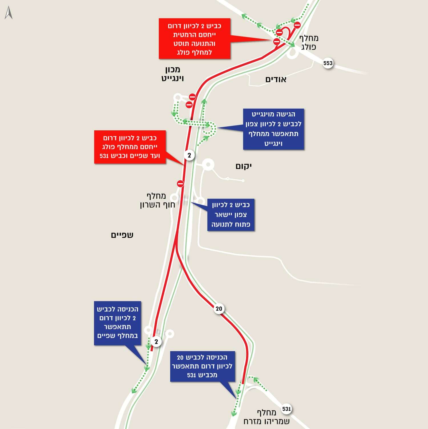 יש לציין שהכניסה ממחלף שפיים לכביש החוף (2) לנוסעים בכיוון דרום תתאפשר כרגיל, הכניסה לכביש איילון (20) לנוסעים בכיוון דרום תתאפשר מכביש 531.