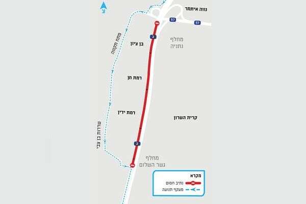 כביש 2 דרום ייחסם לתנועה בין מחלף נתניה למחלף גשר השלום.