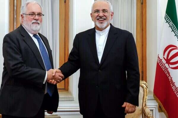 חיוכים ללא כיסוי כלכלי. שר החוץ האיראני מוחמד זריף עם נציג האיחוד האירופי מיגואל אריאס // צילום: AFP