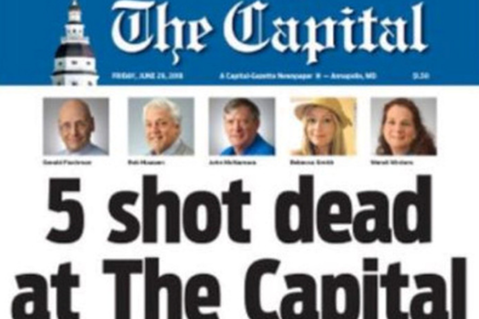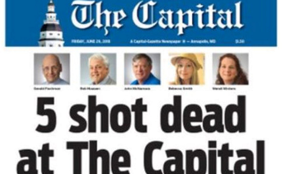 אתמול (חמישי) נכנס ג'רוד רמוס למערכת העיתון "קפיטל גאזט" באנאפוליס, בירת מרילנד, ורצח חמישה מחברי המערכת. הבוקר התפרסם שער העיתון, עליו מתנוססות תמונות הנרצחים, ודיווח על האירוע.