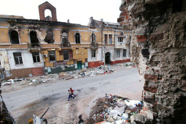 ילדים הולכים בין ההריסות בעיר מריופול | צילום: AP