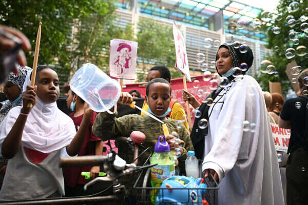הפגנה מול משרד הפנים הבריטי לקראת הטיסה הראשונה לרואנדה | צילום: Leon Neal/Getty Images