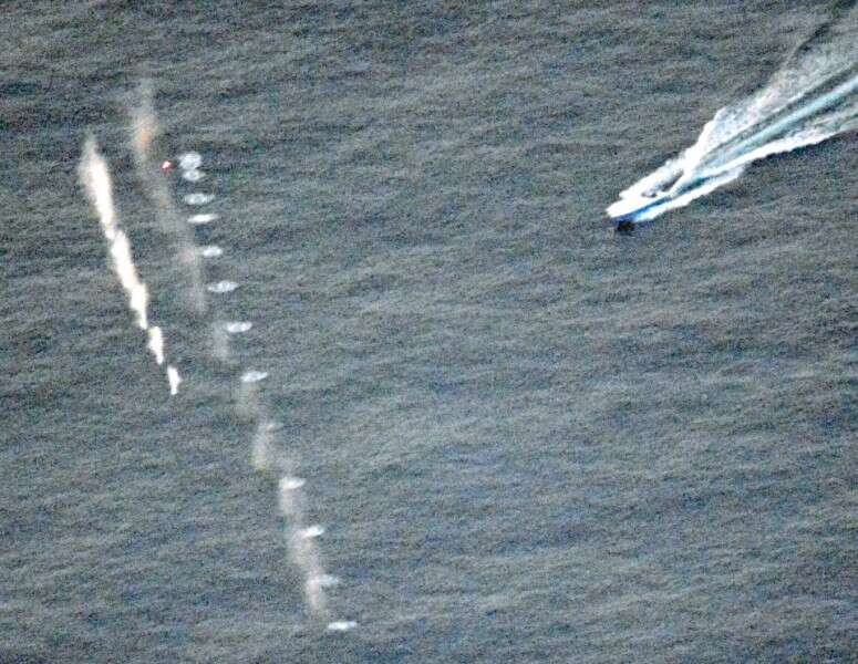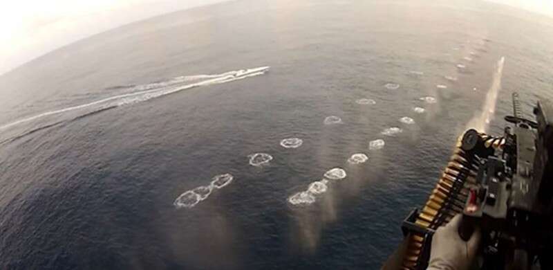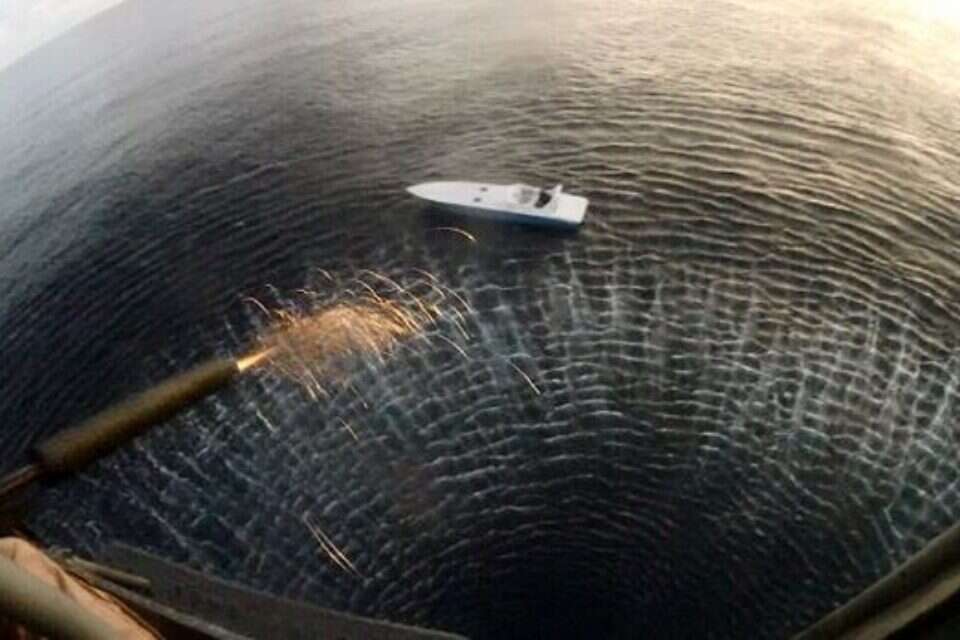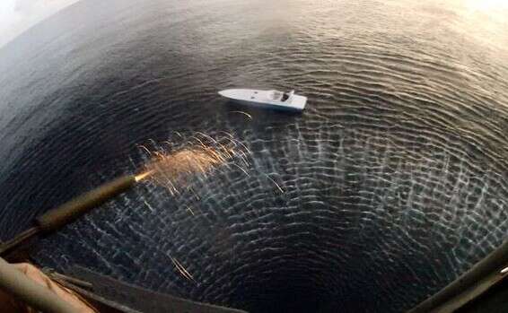יריות האזהרה על פני הגלים מתוך המסוק // צילום: Royal Navy