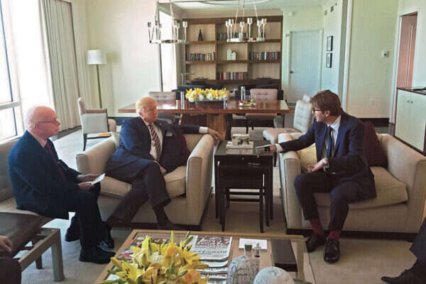 הנשיא הנבחר דונלד טראמפ עם עורך חדשות החוץ בועז ביסמוט (מימין) והעורך הראשי עמוס רגב // הנשיא הנבחר דונלד טראמפ עם עורך חדשות החוץ בועז ביסמוט (מימין) והעורך הראשי עמוס רגב