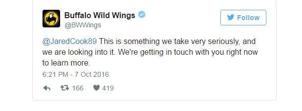 בהצהרה לאתר האינטרנט של ה-Huffington Post, רשת המסעדות טענה כי "'בופאלו ווילד ווינגס' לוקחת את הכנת המזון, השירות והאיכות מאוד ברצינות. אנחנו מצטערים שהגענו למצב זה. פנינו אל ג'ארד קוק ולספקים שלנו כדי לקבל מידע נוסף".