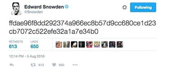 העוקבים אחריו ראו בשבוע האחרון שני ציוצים, כאשר את הראשון מביניהם סנוודן חתם במילים "הגיע זמן", ובציוץ שאחריו קוד המכיל 64 תווים אקראיים.