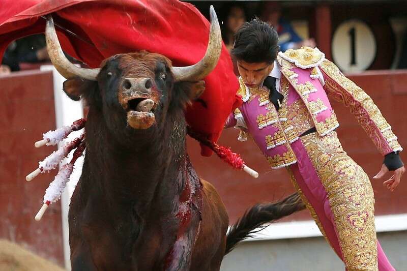 הקרן של השור לורנזו פוגעת בעוצמה בחזה הימני, וגורמת למותו של המטדור // צילום: אי.אפ.פי