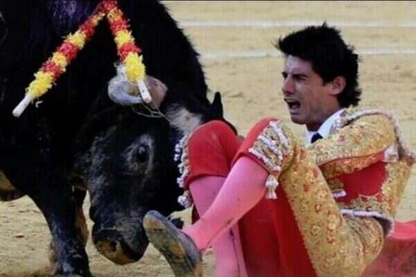 הקרן של השור לורנזו פוגעת בעוצמה בחזה הימני, וגורמת למותו של המטדור // צילום: אי.אפ.פי