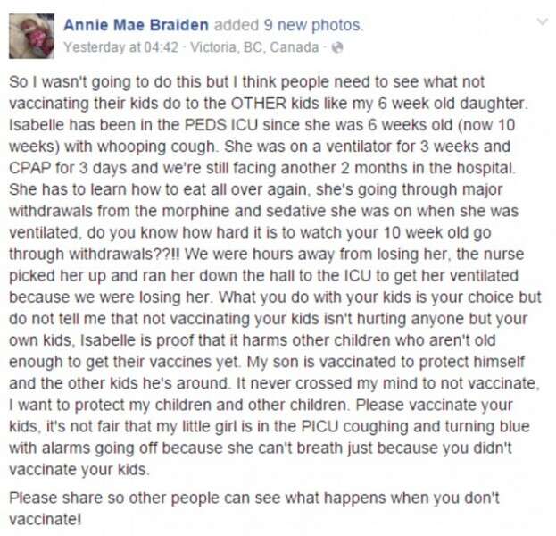 "אנא לחסן את הילדים שלכם, זה לא הוגן שהילדה הקטנה שלי משתעלת, מכחילה ונעזרת במכשירים ששומרים על חייה כי היא לא יכולה לנשום רק מפני שאחרים לא מחסנים את הילדים שלהם", הוסיפה האם.