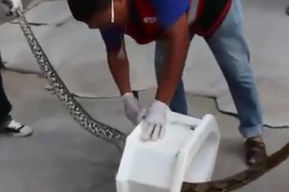 פיתון הענק, כפי שנראה בסרטון, נלכד בעודו בחיים, ונלקח מהבית כאשר הוא עדיין תקוע בצנרת האמבטיה. ואם אתם שואלים את עצמכם מה עלה בגורל הנחש? לוכדי נחשים השיבו אותו בחזרה לחיק הטבע.