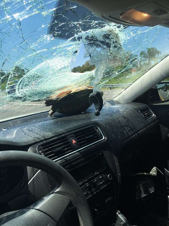 אז איך קורה שצב "מעופף" לו כך לתוך רכב? קציני משטרת פלורידה סיפרו כי הצב נזרק באוויר מרכב אחר שחלף ממול. מארי סבלה מפציעות קלות וטופלה על ידי פרמאדיקים בזירת האירוע. לצב לא נגרם כל נזק והוא הוחזר לבריכה הסמוכה בה שהה לפני האירוע.