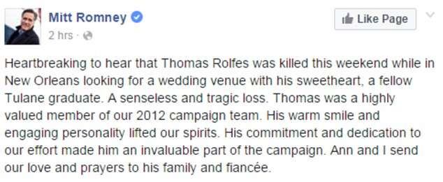 בינתיים, המועמד לנשיאות לשעבר, הרפובליקני מיט רומני, סיפר כי תומאס עבד במסע הבחירות שלו בשנת 2012, ואמר: "קורע לב לשמוע כי תומאס נהרג בסוף השבוע בעודו מחפש מקום להתחתן עם אהובתו".