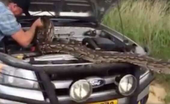 רגעי אימה בנסיעה הביתה: נחש פיתון אימתני התגלה במנוע של מכונית משפחתית בשעה שזו עשתה את דרכה חזרה הביתה.