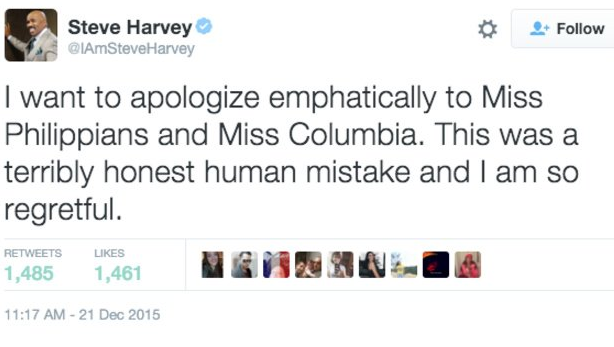עם זאת, זו אינה הפדיחה היחידה של הארווי. מנחה הטקס פירסם בחשבון הטוויטר שלו התנצלות בפני שתי הדוגמניות, אך מחק אותו במהירות. גולשים זריזים הספיקו לצלם את הציוץ וגילו את הסיבה להסרתו - הארווי טעה באיות שמות שתי המדינות: פיליפינים וקולומביה.