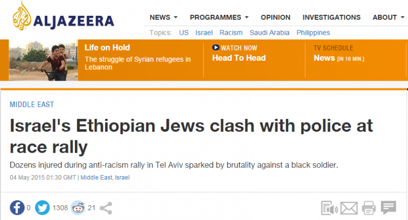 גם ברשת הערבית אל-ג'זירה דיווחו בהרחבה על ההפגנות. אתר האינטרנט של הרשת פרסם דיווחים מלאים על כמות הפצועים, העצורים והנזקים, זאת על ידי כתב של הרשת שנכח בהפגנה. בכותרת הכתבה צויין: "ישראלים יהודים אתיופים הפגינו נגד גזענות בתל אביב".