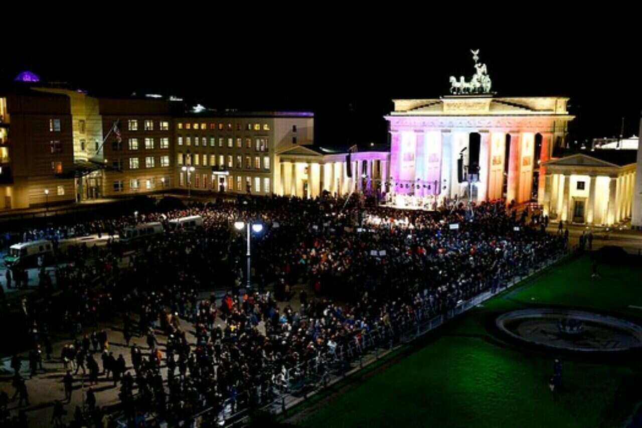 קנצלרית גרמניה, אנגלה מרקל, משתתפת בעצרת בברלין שמארגנות קבוצות מוסלמיות גרמניות לזכר קורבנות הפיגועים בצרפת ונגד הטרור. לפני העצרת מתחה מרקל ביקורת על ארגון אנטי-איסלאמי שהפגין אתמול בדרזדן ואמרה: "לא ראוי להרחיק בני אדם בשל אמונותיהם מהמדינה החופשית בה אנו חיים. זה לא הולם את הערכים שלנו וראוי לגינוי".