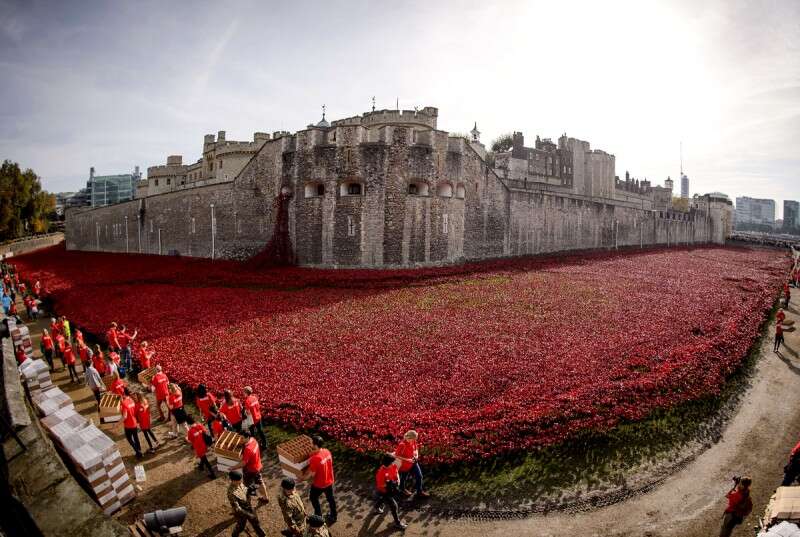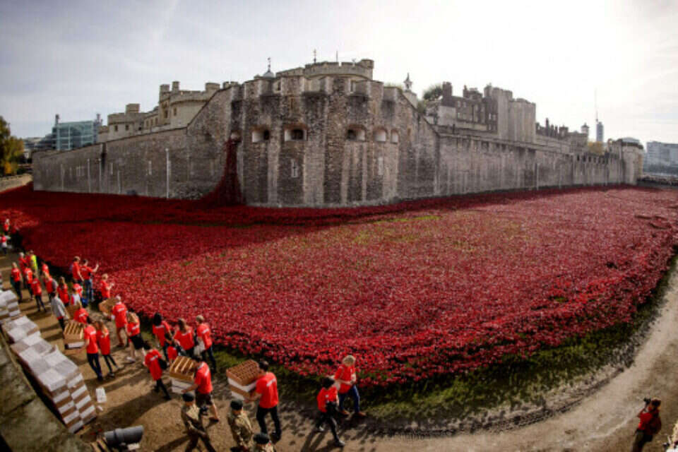 מלכת בריטניה אליזבת' השנייה השתתפה אתמול בטקס יום הזיכרון הבריטי לזכר חללי הצבא הבריטי וצבאות חבר העמים, ובמהלכו הניחה זר של פרחי פרג אדומים באנדרטת הסנוטאף שמול משרד החוץ הבריטי. המלכה השתתפה באירוע על אף הדיווחים כי חוליה של פעילים איסלאמים תיכננו לרצוח אותה באמצעות סכינים. במהלך הטקסים אתמול הלכו רבים לצפות במיצג פרחי הפרג האדומים במצודת לונדון (בתמונה). המיצג, "אדמות שטופות דם וים של אדום", של האמן פול קומינס, כלל 880 אלף פרחי פרג אדומים מקרמיקה, שייצגו את הקורבנות הבריטים במלחמת העולם הראשונה