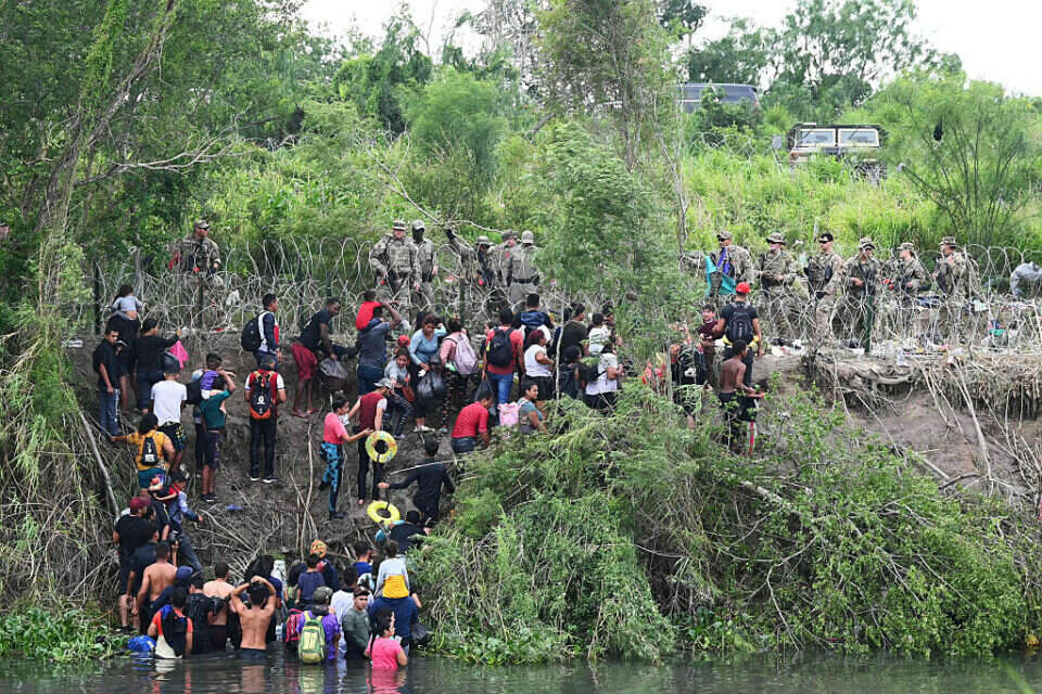 משפחות מהגרים, שחצו את הנהר ריו גרנדה החוצץ לגדה האמריקנית, מול אנשי המשמר הלאומי של טקסס. צילום: אי.אף.פי