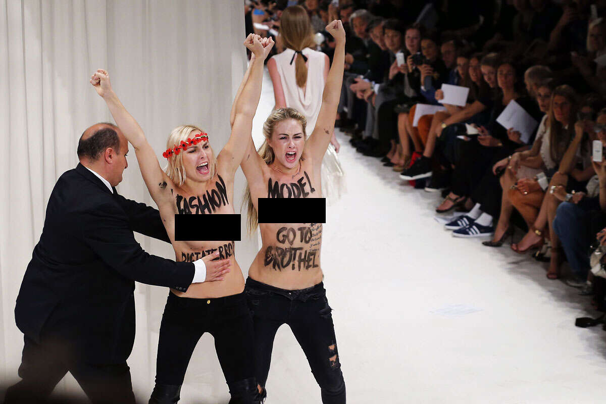 סערה בשבוע האופנה בפריז: מפגינות חשופות חזה שיבשו את תצוגת האופנה של המעצבת נינה ריצ'י.