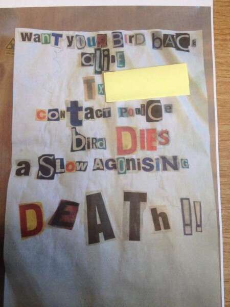 בריטניה: קארה קוסון הופתעה למצוא את הכלוב של התוכי שלה ריק, ובתוכו מכתב כופר שהשאיר אדם שפרץ לביתה. המכתב, שהורכב מגזירי אותיות של עיתונים ומגזינים, הזהיר אותה: "אם תתקשרי למשטרה התוכי שלך ימות לאט ובייסורים".