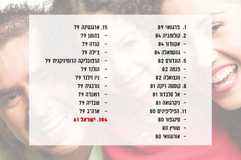 ארה"ב קטפה את המקום ה-15 המכובד יחד עם שבדיה, ואילו בריטניה ממוקמת במקום ה-43. מדינות במזרח התיכון, בצפון אפריקה ובמזרח אירופה קיבלו את הציונים הנמוכים ביותר במדד האושר. ומה איתנו? ישראל דורגה במקום 104.